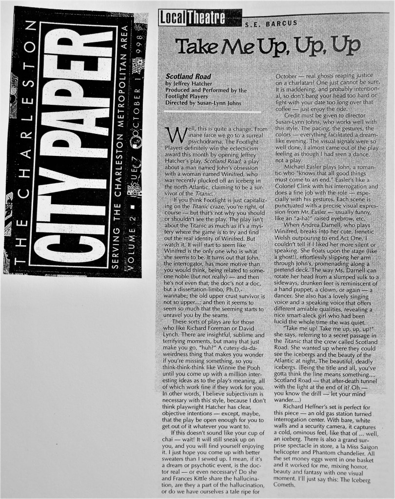 Continuing posts from the archives…. From October 14, 1998, a review of Footlight’s production of Scotland Road, by Jeffrey Hatcher. Look — more ghosts!