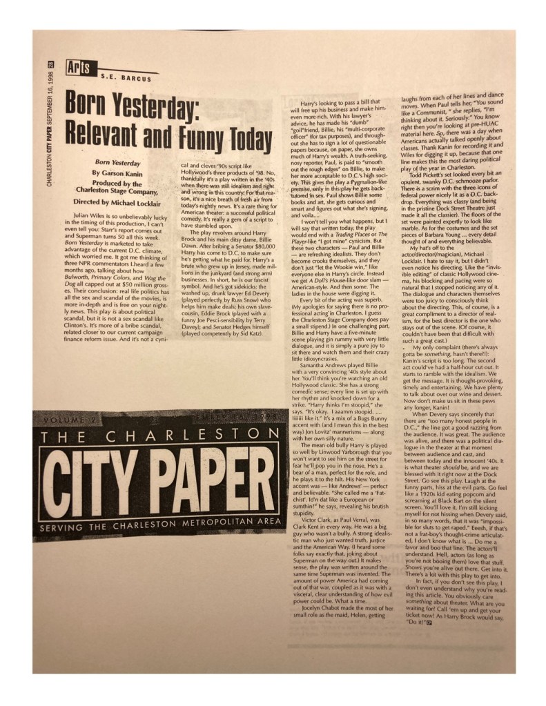 I’m gonna start popping out the theater reviews I did, now, along with the music. Here’s a review of Charleston Stage Company’s “Born Yesterday”, by Garson Kanin. The piece itself is dated, but still fun. This review itself is dated, but brings back nice memories of Charleston’s thriving local theater scene. September 16, 1998.