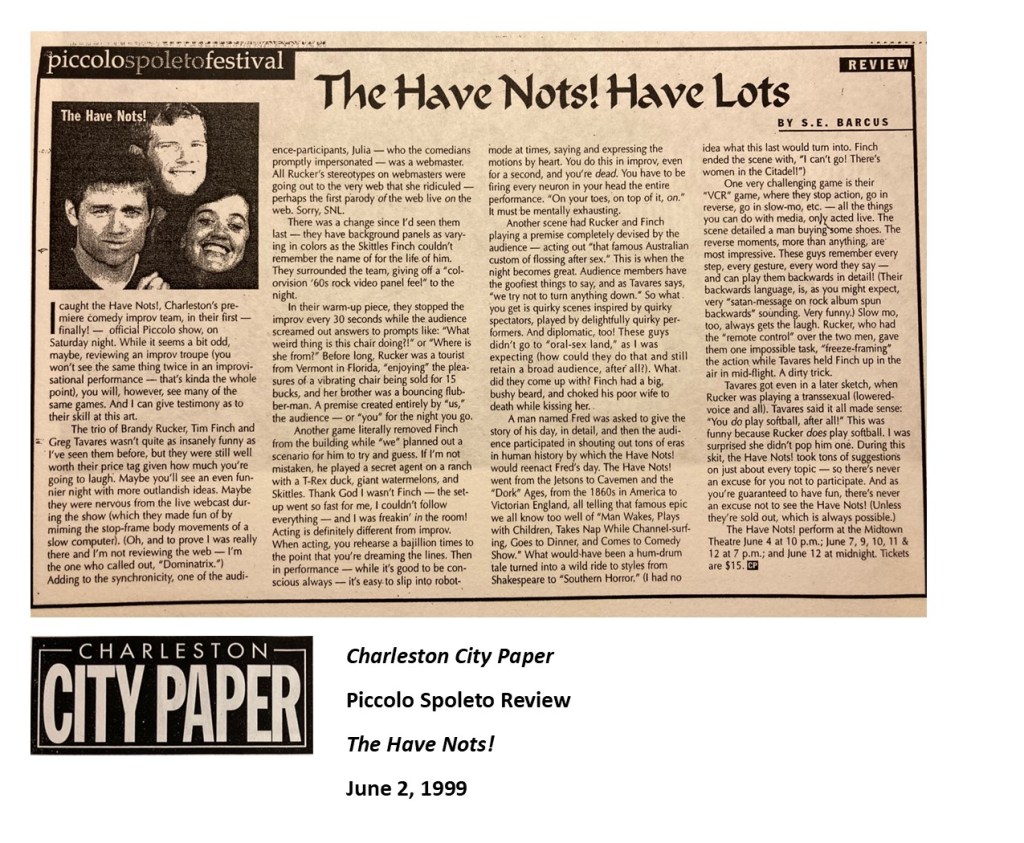 MAN! Brandy, Tim, and Greg are still kicking it! They just performed this past Saturday, April 16th! Charleston is lucky to have such dedicated comedy and theater artists successfully bringing it to the Lowcountry. I have been to Second City in Chicago several times. I always had just as much fun with The Have Nots! Other cities Charleston’s size do NOT have this. Support it.