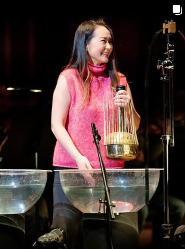 Then, balancing the fire — the coolness of the water, with the amazing “Water Concerto” (how could it not be amazing, being dedicated to Takemitsu?!). Our percussionist, Yuri Yamashita, opened the piece breaking the 4th wall, coming down through the audience aisle with some watery percussive instrument called the waterphone, that looks like a World Series trophy. Video showed her hands close up in the two drums of water, with their hands getting sounds of subtle drips or splashes, depending on maneuvering (the same techniques, of which, could be seen by Seattle Symphony’s percussionists in “Nu Shu”…). Extended techniques of the horns made them sound like kazoos, or even like silly haunted house winds.