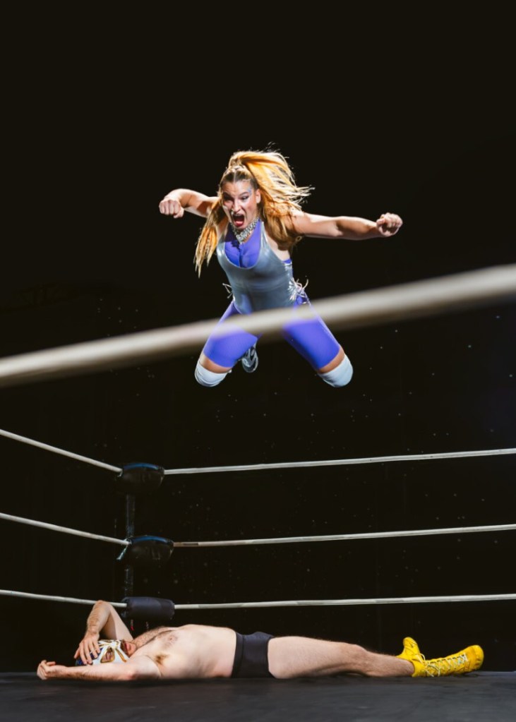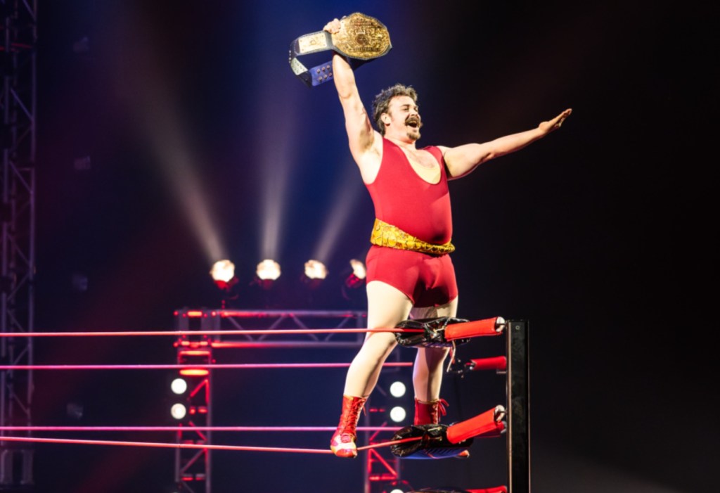 You know, it was pretty genius to mix a contemporary circus piece with a WWF theme. Everyone knows pro wrestling is “fake.” And that theater is “fake.” We suspend our disbelief in both places. But here – we have a theatrical show, about pro wrestling. Fake upon fake. (Is that a double negative?) Only – while the “punches” are actually just loud slaps and pre-choreographed flips – this show shoves in your face just how talented you have to be to pull this stuff off. Somersaulting yourself in mid-air as if you’d been hit – but hadn’t, really – might actually be HARDER, due to the lack of force actually pushing you into the air. Your own body and core has to mimic the thousands of Newtons of force a punch would’ve delivered. You have nothing to leverage. You have to do it yourself!