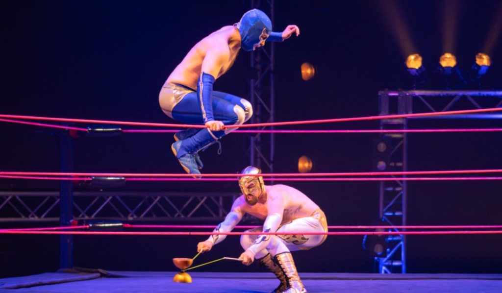 Then we gets our Mexican wrestlers! Our luchadors! A good guy vs a “Diablo” – who is complete with devil horns and a Day of the Dead sidekick! This diablo (Jérémie Arsenault, one of the founding members of FLIP), has a secret weapon that he uses in the ring. He juggles – or rather spools – it out against his foe. He even uses it as a garrote once (eesh!). Can you guess what this weapon is? A diabolo, of course! Get it!? (Oo, oo, oo – idea! — in a future show, have him use this ‘devil on two sticks,’ while on stilts! So, he, too, would be a ‘devil on two sticks!’)