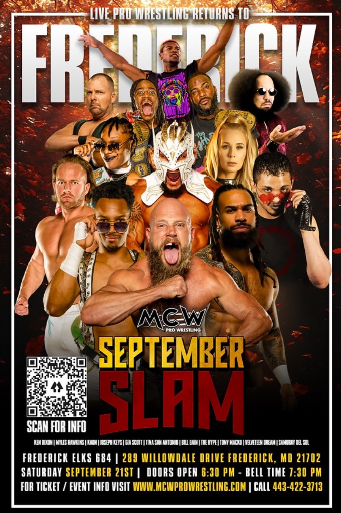 SLAM! starts with an older, really frail Tim-Conwayesque-looking fellow suddenly doing an hilarious faceplant to set the tone for the night (in case someone thought they’d be seeing “REAL” wrestling matches, or something!), and a vocal reminder to us, that we, the audience, are also a character in this exaggerated sport of costumed heroes and villains. We are encouraged to act our part — to scream bloodthirsty cries and hoot and holler for “our side,” and feign outrage when any dastardly deeds are done!
