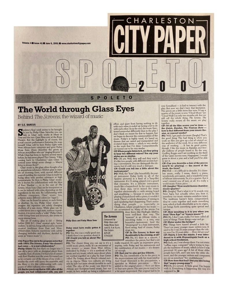 My archives, June 6, 2001, posting by coincidence w Philip Glass’ 85th birthday bash. Happy Birthday! My interview with Philip Glass just before his 2001 Spoleto performance of The Screens, a collaborative piece composed along with West African-born composer and griot, Foday Musa Suso. What an honor for me. My fellow-critic/friend, Robert T. Jones, then critic for Charleston Post and Courier, and editor for Glass’ “Music by Philip Glass”, hipped me to the composer (and fellow Marylander!). See for yourself in the interview, he’s a swell guy!