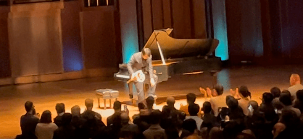 But also — flamboyant. He might not have the long hair of a cheerleader to do a hair toss, but he’ll still throw his head backwards, dramatically, at times, nonetheless, to accentuate forte chords, and to take in the whole sky above him. (Although — he did dress a bit more conservatively for Seattle, in a nice black suit, not the cool white suit with white turtleneck, like he wore at the recent Milano Cortina Olympics. Or the groovy blue silk pants and white caped-suit-jacket for the 2008 Olympics.) To finish the Pathetique, he alternated between that pleasant Chico body language and the first movement’s ferocious one, depending on the phrasing. And continued to tap notes individually with one pointer finger, very ostentatiously, slapping a note, or after hitting it, pulling the hand up or out, like a wizard with a wand, or a dancer. He is first, and foremost, a crowd-pleaser.